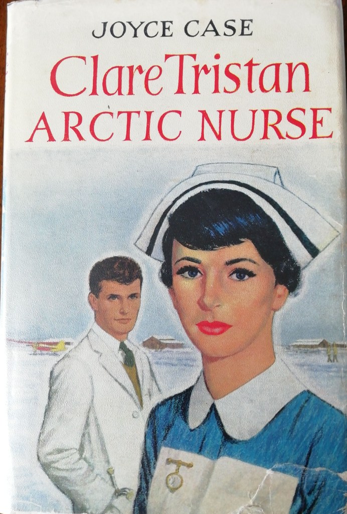 So, let’s start with the dust wrapper. First of all: those eyes. I recognised them from somewhere else. Right enough, AE Batchelor, the artist, also illustrated the dust wrapper of my copy of Drina Goes on Tour by Jean Estoril and those eyes are Drina’s as well as this nurse’s. Next up, this is the cover of a romance, not a career novel for teens. And thirdly, what are Mark and Andrea (I assume it’s them) doing standing around outside in the Arctic dressed for the wards of a city hospital in the UK?
