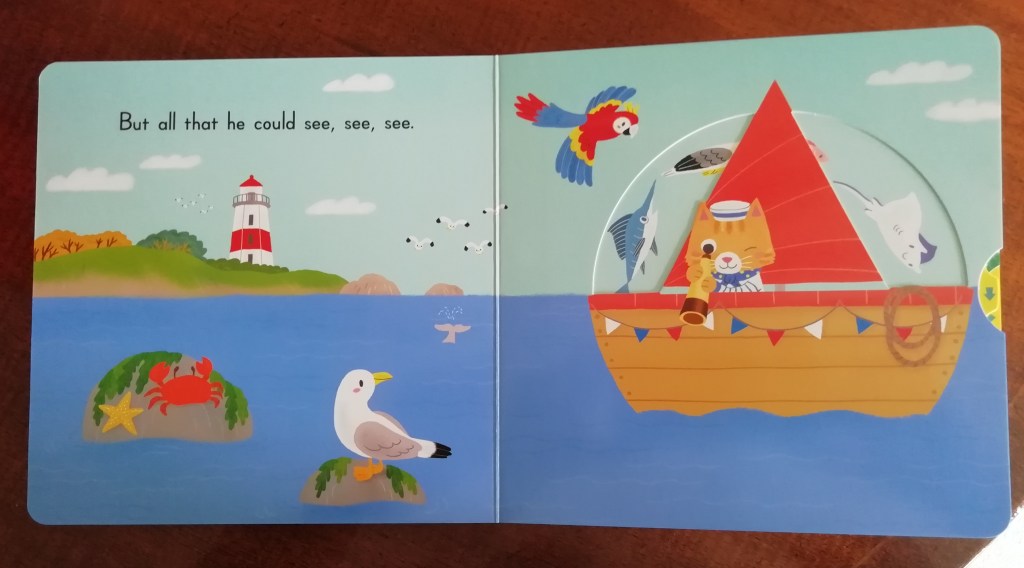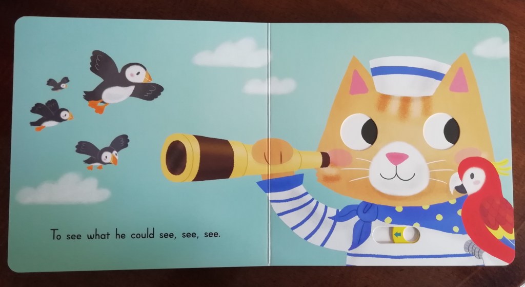 The illustrations are by Yu-hsuan Huang and are endearing in the extreme without being too cutesy. The lines, shapes and colours are engaging and welcoming and the spreads have enough in them to hold the interest without being daunting. Regular readers of this blog will understand when I say that they’re made even better because the sailor in question is a cat. And there’s a lighthouse – and puffins. Admittedly it’s an unusual seascape that contains puffins along with gulls and a parrot…