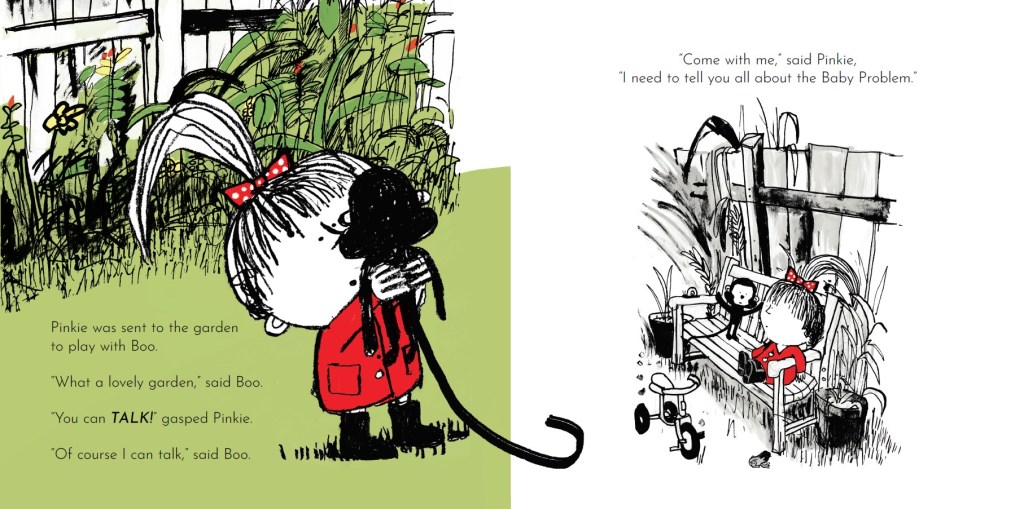 I’m always interested in the relationship between the text and the illustrations in a picture book and I particularly enjoy it when they tell different stories or perspectives. In Pinkie and Boo there’s a lovely element of doubt too: does Pinkie know that she’s behaving badly or does she actually think that she and Boo have tried their very best? It can be read either way and will doubtless be interpreted in the light of individual circumstances.