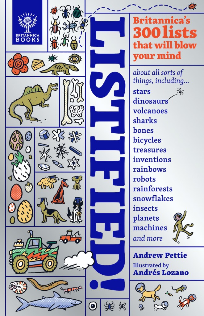 I’m a librarian to trade, and so predisposed to appreciate the ordering of knowledge. So there were few risks inherent in giving me this book to review. Published by Britannica Books, Listified! is pretty much what it says: 300 lists on a variety of subjects. Don’t let that put you off though. The lists are varied, quirky and often full of startling information. Alongside Andrew Pettie’s text, there are hundreds of illustrations by Andres Lozano which all add to the general fascination of the book.