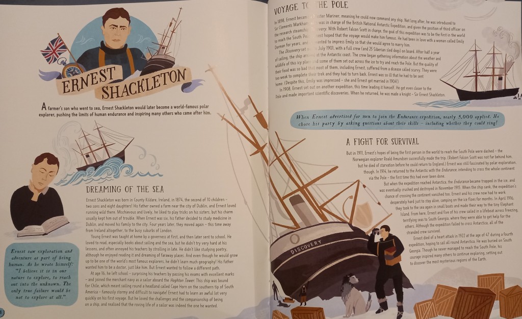 As regular readers here know, I am fascinated by ships and the sea. So I was delighted to see that Ernest Shackleton makes it into this book. He’s so often overlooked in favour of Robert Scott with whom he sailed on RRS Discovery (now safely moored in her birthplace of Dundee where she has been visited by me a number of times!). Interestingly – and I do mean that – his 1914 voyage on Endurance is only mentioned briefly as it fits in with his other travels. I enjoyed the opportunity to contextualise his most famous exploit.