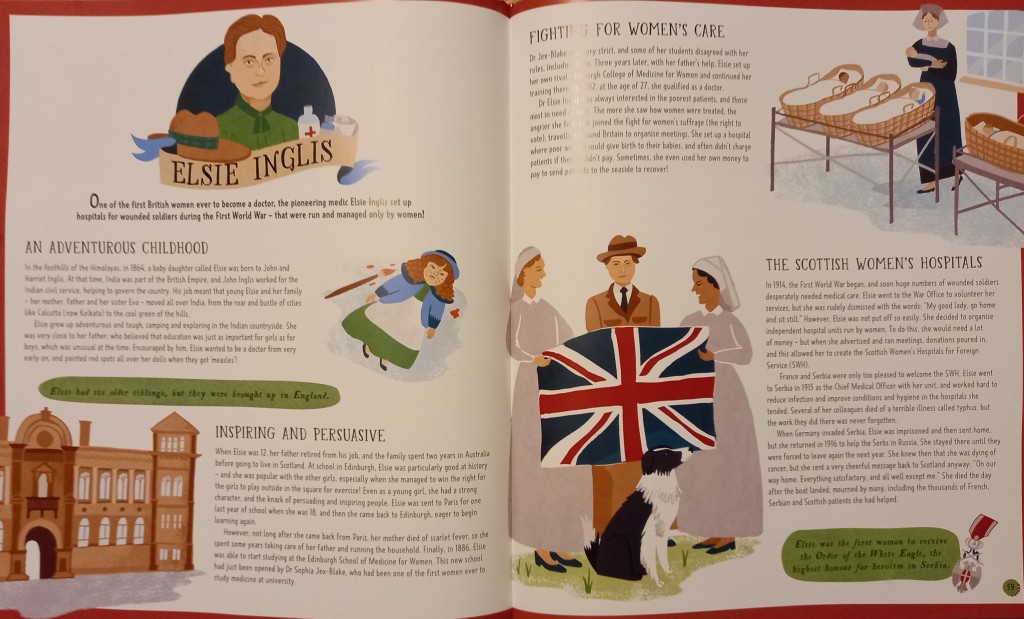 Great Britons passed my first test: it includes Elsie Inglis. Better known now than she was when I was a child, her work is still shamefully undervalued. More recognised in Serbia than Scotland (never mind elsewhere in the UK), she is one of my heroes. Suffragist, doctor, campaigner for the poorest in society, she is probably now best known for her First World War service in Serbia and Russia. Having been told by the War Office to ‘go home and sit still’ when she volunteered her medical services, Elsie went back to Edinburgh and raised funds to set up independent hospital units run by women – the Scottish Women’s Hospitals for Foreign Service.