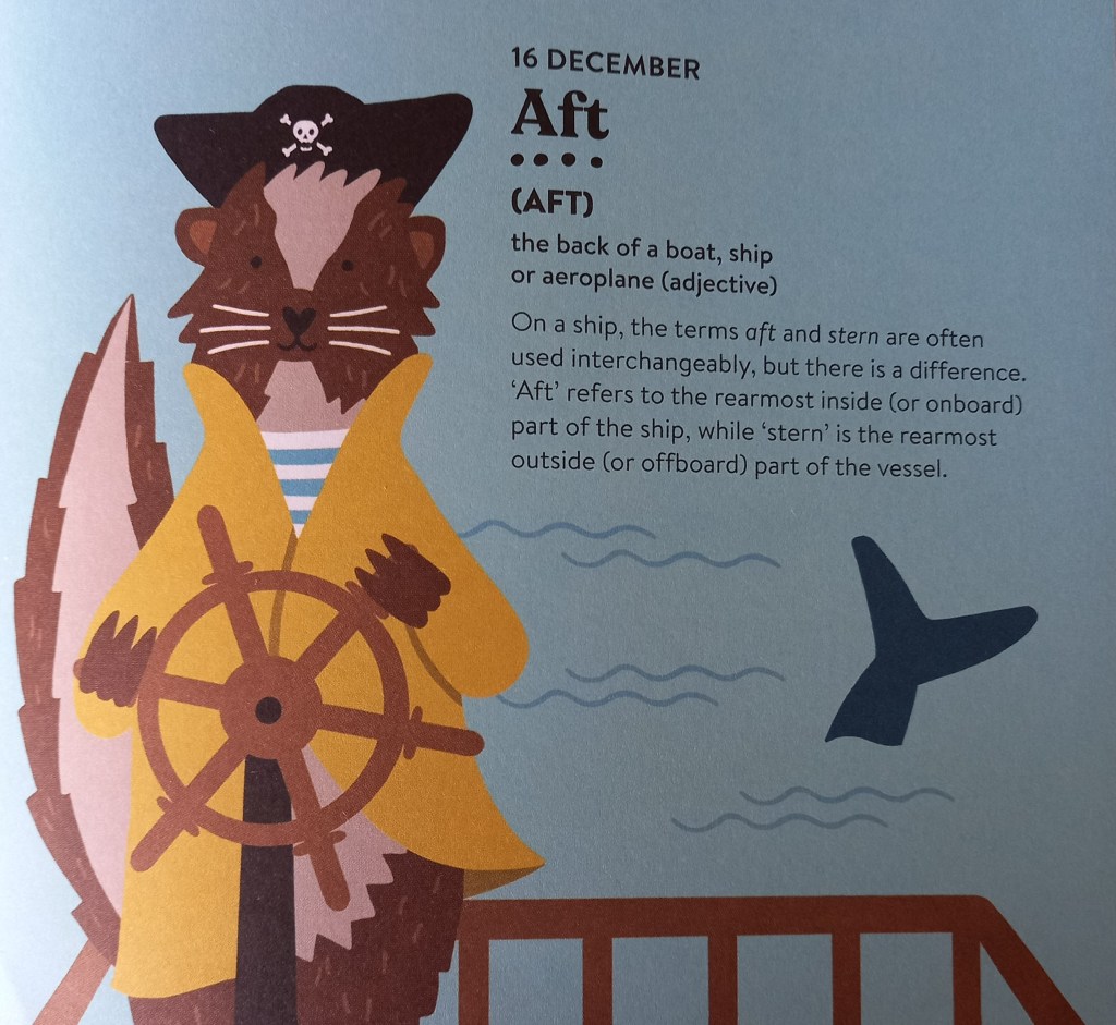 My favourite word? That it’s impossible to select just one is indubitable (21. April). I could choose odyssey (18. August) as it’s what I like to go on or wanderlust (20. March) because it’s what I have or verisimilitude (4. May) in honour of the kind of characters I enjoy reading about whilst travelling. But in the end I’ve chosen Aft (16. December). It’s short and specific in its meaning. And it conjures up for me memories of voyages in glorious sunshine and spellbinding ice. You can keep – mostly – your landlocked (9. November) countries. Aft is my location of choice – unless I’m hanging over the stern, of course, watching the trail we’re leaving behind.