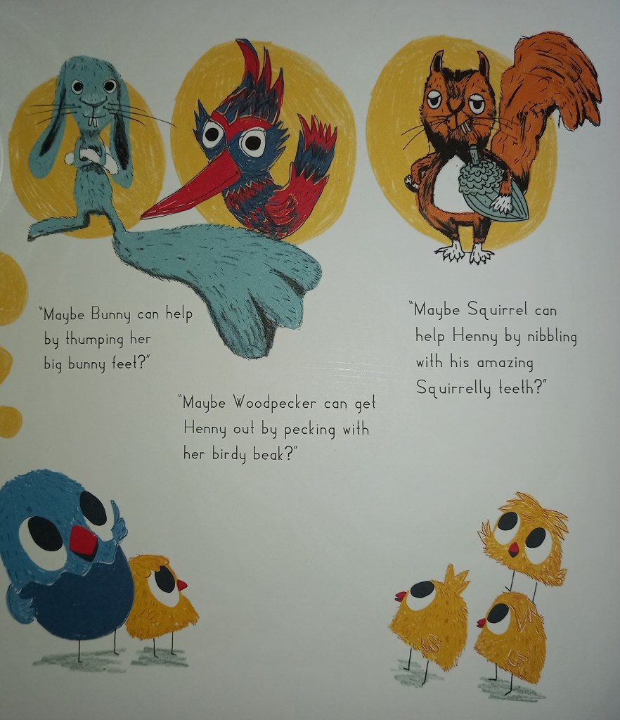 Her friends try to help. Bunny thumps. Woodpecker pecks. Squirrel nibbles. But none of them can help. Poor Henny is very sad. She feels different to all the other chicks. She’s too slow and too clumsy.