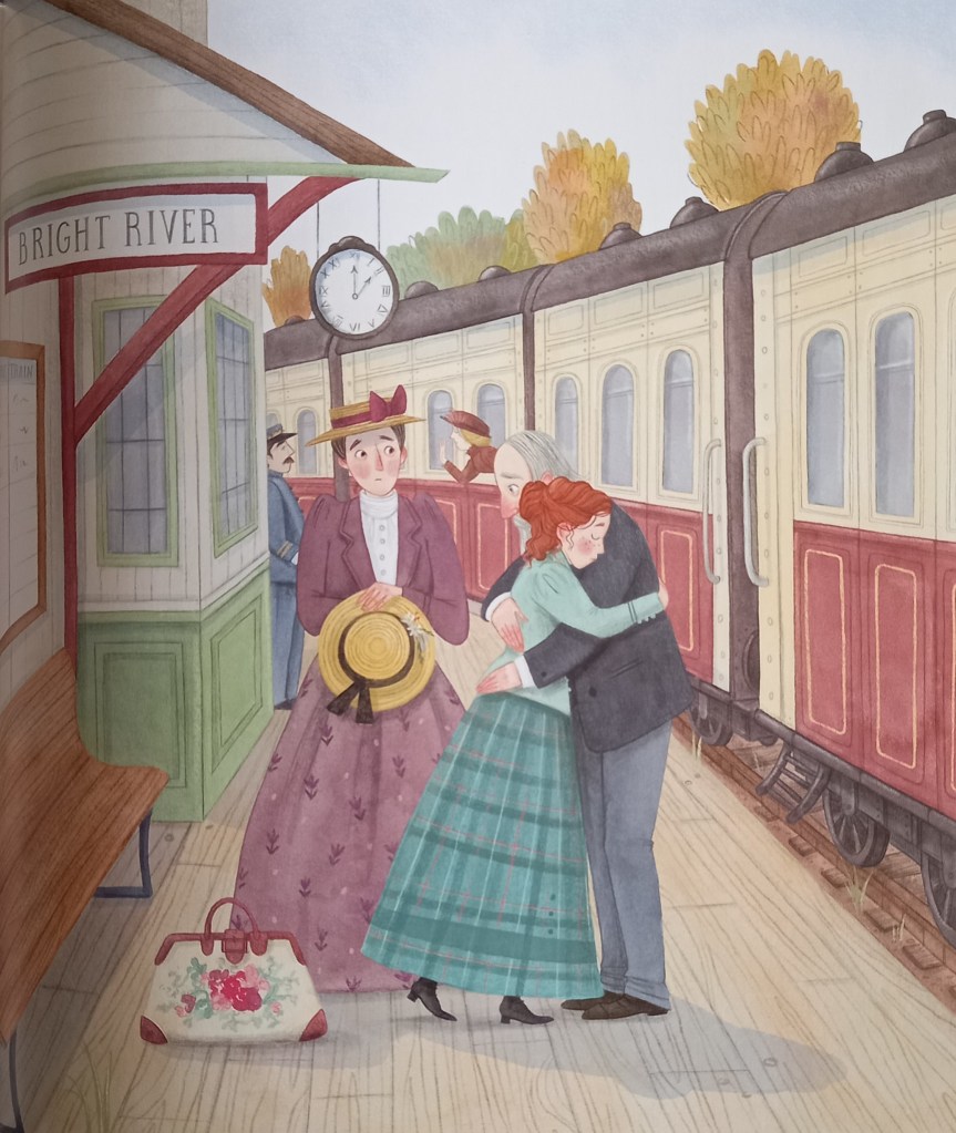 So much for the cover. Inside, I was charmed. Here I think Isabelle Follath has got it just right. Mrs Rachel Lynde and Marilla Cuthbert leap off the page as though the artist had plucked them from my imagination; and the Anne who meets Matthew at Bright River Station feels completely human and of the real world. Diana and Mrs Barry, Mr Phillips and the Avonlea schoolroom all fit in beautifully to their drawn world. And Gilbert Blythe is just perfect. The backdrops are evocative bringing to life the setting in time and place.